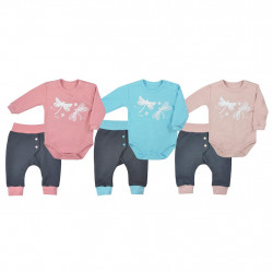 Detská 2-dielna súpravička Koala Vážky. Súčasťou súpravičky sú tepláčky a body. Body má zapínanie na cvočky na ramienku a medzi nožičkami. Zdobí ho krásny obrázok vážky. Tepláčky majú na nohavičkách a páse široký lem, imitáciu cvočkov a štýlový znížený sed, ktorý dodáva teplákom ten správny šmrc. Materiál: body: 100% bavlna.