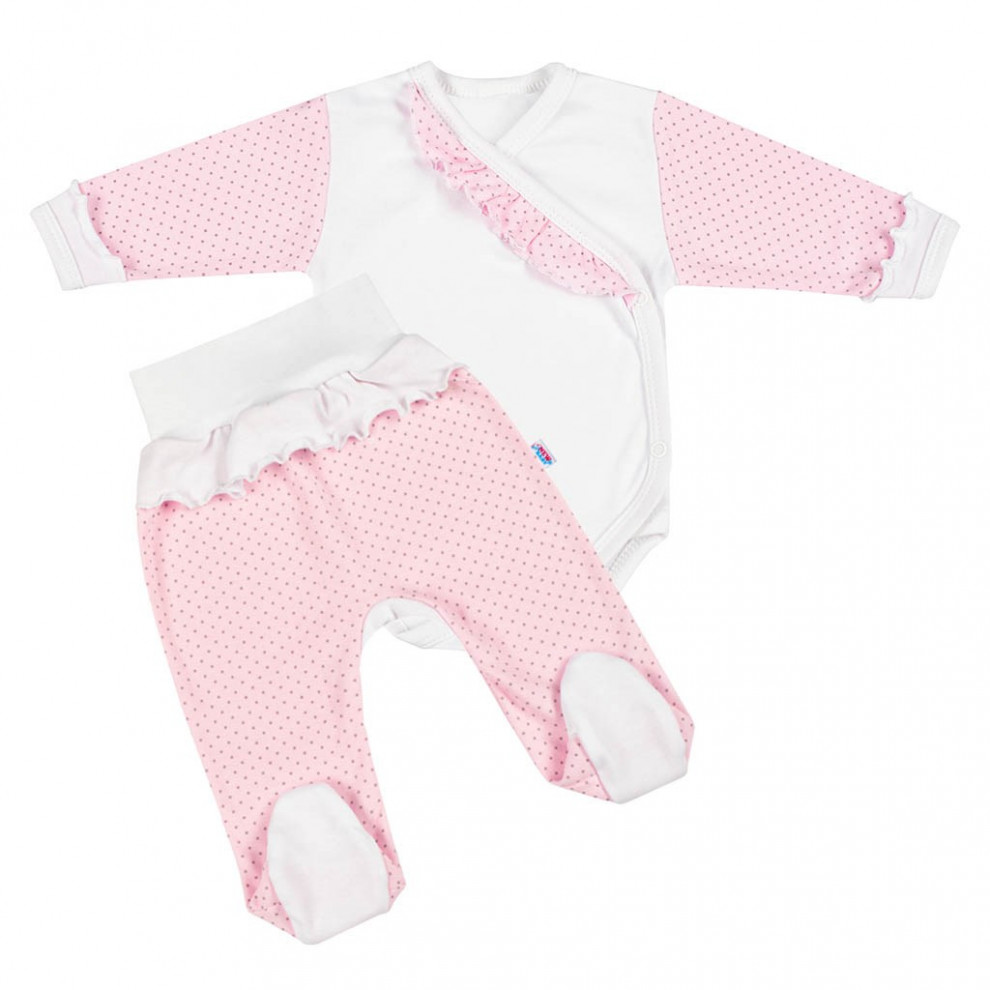 2-dielna bavlnená súpravička New Baby Bodka II s volánikmi a bodkami. Dievčenská súpravička obsahuje polodupačky a body. Body s dlhým rukávom má zapínanie na bočnej strane a medzi nožičkami na cvočky. Je zdobené bodkovanými rukávkami a roztomilými volánikmi. Polodupačky majú sťahovací pružný lem, ktorý netlačí na bruško bábätka a na prednej strane okolo pása roztomilý volánik. Zloženie 100% bavlna.