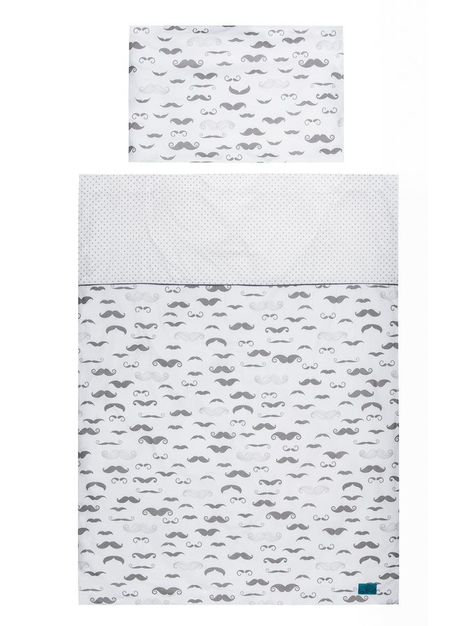 Detská bavlnená 5-dielna súprava do postieľky Belisima Little Man pre bábätká. Súpravu zdobia originálne obrázky fúzov a príjemné farby. Je vyrobená z mäkkého, príjemného materiálu. Súprava obsahuje obliečky na vankúšik cca 40x60 cm, obliečky na paplón cca 100x135 cm, hniezdo cca 180 cm, vankůš a paplón. Materiál 100% bavlna.