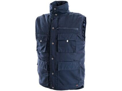 Pánská zateplená vesta s prodlouženým zadním dílem, zapínání na druky, 4 vnejší kapsy s klopou, náprsní kapsa na zip, reflexní doplňky.