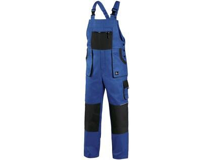 Pánské montérkové kalhoty s náprsenkou, náprsní kapsa na zip, pas vzadu do gumy, přední kapsy, boční kapsa na svinovací / skládací metr, boční kapsa na mobil / peněženku, zdvojená kolena, zadní kapsa s klopou, šle s gumou vzadu, reflexní doplňky. Doporučené použití: stavebnictví, lehký průmysl, logistika, skladová manipulace, autoservisy, údržba, montáže, zemědělství, zahrada, hobby.