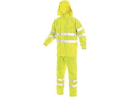Výstražný oděv s reflexními pruhy, nepromokavý, lepené švy, kapuce v límci, bunda na zip ktytý legou, raglánové rukávy v manžetě do gumy, dvě spodní kapsy s patkou. Kalhoty v pase do gumy, dvě boční kapsy, šířka nohavic regulovatelná cvoky. Oblek je složen v praktickém balení. Doporučené použití: stavebnictví, silničáři, řidiči, logistika, údržba, popeláři, automyčky, chemické postřiky, mokré prostředí.