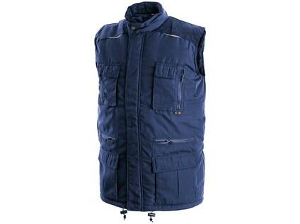 Pánská zateplená vesta, ramena a límec pošitý manšestrem, pružné stažení průramku, zapínání na zip krytý légou, stahování v dolním okraji, 8 vnějších kapes, reflexní doplňky, vnitřní kapsa na zip.