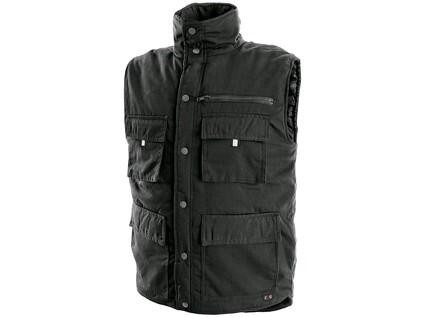 Pánská zateplená vesta s prodlouženým zadním dílem, zapínání na druky, 4 vnejší kapsy s klopou, náprsní kapsa na zip, reflexní doplňky.