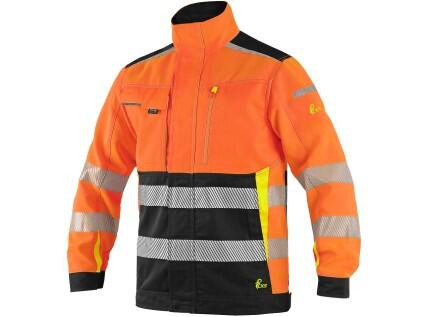 Pánská výstražná blůza, ramena zesílena materiálem CORDURA, rukávy s nastavitelnou manžetou na suchý zip, kryté zapínání na zip, suché zipy a druky, levá náprsní kapsa na zip, pravá krytá klopou, v pravé kapse odnímatelné pouzdro na ID kartu, na levém rukávu kapsička na tužky, boční kapsy na zip, segmentované reflexní pásky (šíře 5 cm), kontrastní žluté/oranžové a reflexní doplňky. Doporučené použití: stavebnictví, silničáři, údržba, logistika, letecká a lodní doprava.