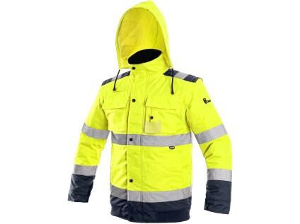 Pánská výstražná zateplená bunda do pasu, 2 v 1, odolná proti vodě a větru, reflexní pruhy, lepené švy, zapínaná na zip krytý legou, odepínací rukávy s regulovatelnými a vnitřními manžetami, kapuce v límci, fleecový vnitřní límec, v délce pružný pas, 2 spodní kapsy, dvě náprsní kapsy kryté patkou na suché zipy, na levé straně poutko na přichycení ID karty, na pravé straně smyčka na radiostanici, jedna vnitřní kapsa. Uvnitř je zip pro snadnou aplikaci výšivky na vnější straně bundy. Doporučené použití: stavebnictví, silničáři, řidiči, logistika, údržba, popeláři, záchranáři, v zimě a mokrém prostředí, dělníci.
