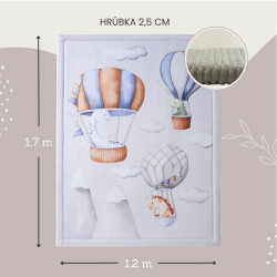 Detský koberec Dinosaur Balloons 1.7 x 1.2 mBezpečné a pohodlné miesto na hranieDetský koberec Dinosaur Balloons je skvelým miestom pre deti na hranie, lezenie aj oddych. Má tri vrstvy – mäkký koralový zamat, pohodlnú elastickú pamäťovú penu a protišmykovú podložku, ktoré zaručia bezpečné a pohodlné hranie na zemi. Pamäťová pena je hrubá 2 cm a rýchlo sa vracia do pôvodného tvaru, čo je výhodou oproti lacnejším kobercom. S rozmermi 170 x 120 x 2 cm je dostatočne veľký nielen na detské hry, ale aj na jogu alebo relax.Štýlový a praktický doplnok do domácnostiDetský koberec s motívom dinosaurov v balóne krásne doplní váš interiér. Jeho praktický dizajn umožňuje jednoduchú starostlivosť a ľahkú údržbu – stačí ho povysávať alebo utrieť vlhkou handričkou. Navyše, je vyrobený bez škodlivých látok ako sú BPA či ftaláty, takže si môžete byť istí, že vaše dieťa bude v bezpečí.