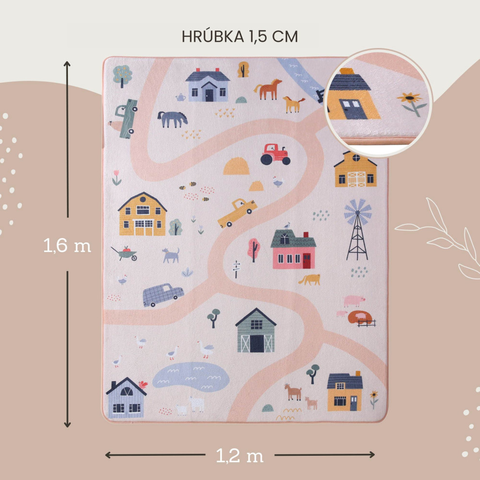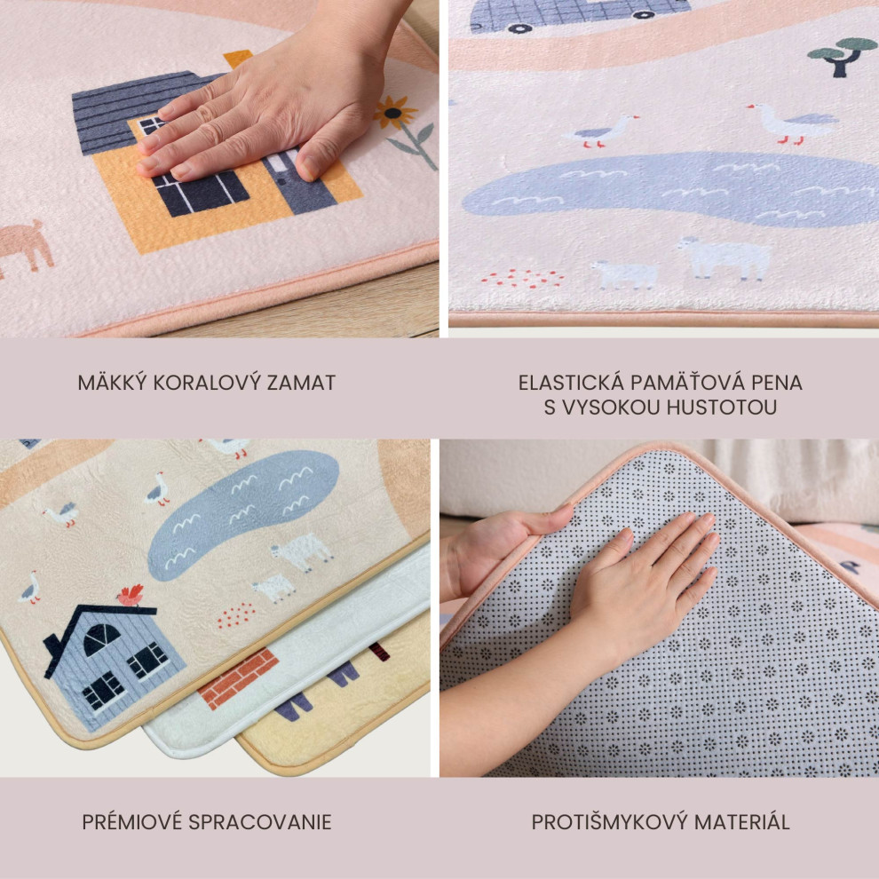 Detský koberec Farm 1.6 x 1.2 mBezpečné a pohodlné miesto na hranieDetský koberec Farm je skvelým miestom pre deti na hranie, lezenie aj oddych. Má tri vrstvy – mäkký koralový zamat, pohodlnú elastickú pamäťovú penu a protišmykovú podložku, ktoré zaručia bezpečné a pohodlné hranie na zemi. Pamäťová pena je hrubá 2 cm a rýchlo sa vracia do pôvodného tvaru, čo je výhodou oproti lacnejším kobercom. S rozmermi 160 x 120 x 1.5 cm je dostatočne veľký nielen na detské hry, ale aj na jogu alebo relax.Štýlový a praktický doplnok do domácnostiDetský koberec s motívom farmy krásne doplní váš interiér. Jeho praktický dizajn umožňuje jednoduchú starostlivosť a ľahkú údržbu – stačí ho povysávať alebo utrieť vlhkou handričkou. Navyše, je vyrobený bez škodlivých látok ako sú BPA či ftaláty, takže si môžete byť istí, že vaše dieťa bude v bezpečí.