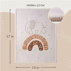 Detský koberec Rainbow Elephant 1.7 x 1.2 mBezpečné a pohodlné miesto na hranieDetský koberec Rainbow Elephant je skvelým miestom pre deti na hranie, lezenie aj oddych. Má tri vrstvy – mäkký koralový zamat, pohodlnú elastickú pamäťovú penu a protišmykovú podložku, ktoré zaručia bezpečné a pohodlné hranie na zemi. Pamäťová pena je hrubá 2 cm a rýchlo sa vracia do pôvodného tvaru, čo je výhodou oproti lacnejším kobercom. S rozmermi 170 x 120 x 2 cm je dostatočne veľký nielen na detské hry, ale aj na jogu alebo relax.Štýlový a praktický doplnok do domácnostiDetský koberec s motívom sloníka krásne doplní váš interiér. Jeho praktický dizajn umožňuje jednoduchú starostlivosť a ľahkú údržbu – stačí ho povysávať alebo utrieť vlhkou handričkou. Navyše, je vyrobený bez škodlivých látok ako sú BPA či ftaláty, takže si môžete byť istí, že vaše dieťa bude v bezpečí.