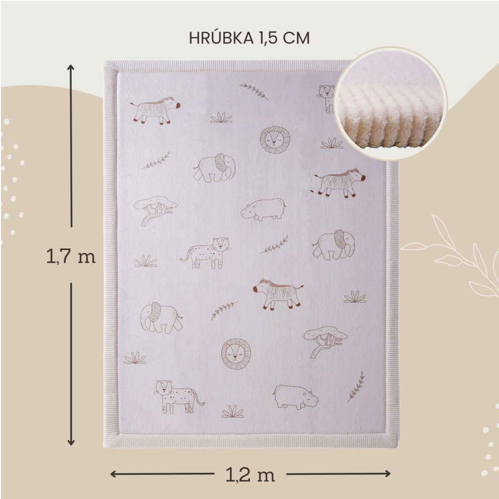 Detský koberec Safari Animals 1.7 x 1.2 mBezpečné a pohodlné miesto na hranieDetský koberec Safari Animals je skvelým miestom pre deti na hranie, lezenie aj oddych. Má tri vrstvy – mäkký koralový zamat, pohodlnú elastickú pamäťovú penu a protišmykovú podložku, ktoré zaručia bezpečné a pohodlné hranie na zemi. Pamäťová pena je hrubá 2 cm a rýchlo sa vracia do pôvodného tvaru, čo je výhodou oproti lacnejším kobercom. S rozmermi 170 x 120 x 2 cm je dostatočne veľký nielen na detské hry, ale aj na jogu alebo relax.Štýlový a praktický doplnok do domácnostiDetský koberec s motívom zvierat zo Safari krásne doplní váš interiér. Jeho praktický dizajn umožňuje jednoduchú starostlivosť a ľahkú údržbu – stačí ho povysávať alebo utrieť vlhkou handričkou. Navyše, je vyrobený bez škodlivých látok ako sú BPA či ftaláty, takže si môžete byť istí, že vaše dieťa bude v bezpečí.