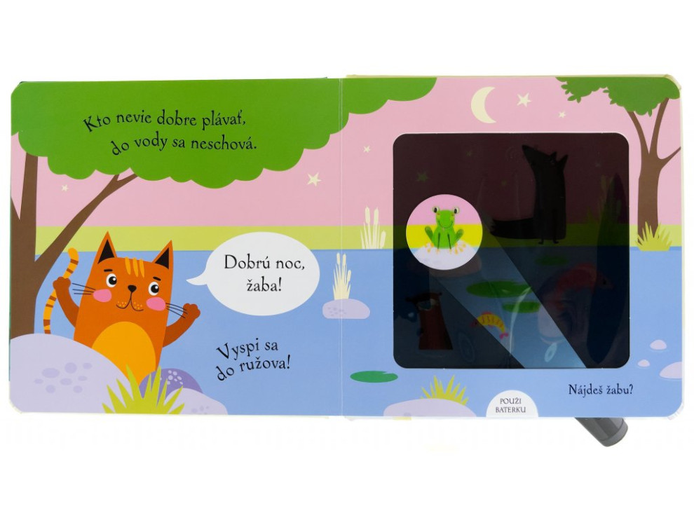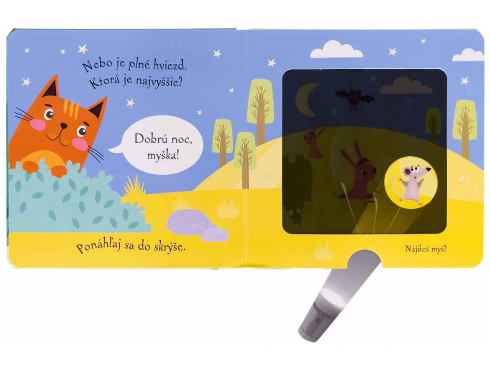 Dobrú noc, mačička!Kúzelné čítanie na dobrú noc pre deti.Mačička sa už chystá spať, ale najprv musí dať dobrú noc všetkým svojim zvieracím kamarátom. Pomôžeš jej ich nájsť?Kniha s kúzelnou baterkou.Pomôž mačičke pomocou kúzelnej baterky nájsť všetkých jej zvieracích kamarátov ukrytých v knižke. Čítanie vo veršoch, ideálne do postieľok. Vsuň kúzelnú baterku medzi stránky a zisti, kto sa ukrýva v každej ilustrácii zobrazujúcej noc. Text vo veršoch učia deti vnímať prirodzený rytmus reči. Šikovne vyrobené okienka umožňujú deťom hľadať schované zvieratká pomocou priloženej kartónovej pomôcky v tvare svietidla. Ponúknite dieťaťu pred spaním nejakú upokojujúcu aktivitu. Táto knižka je na to priam stvorená.