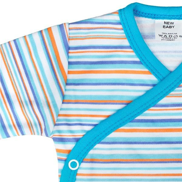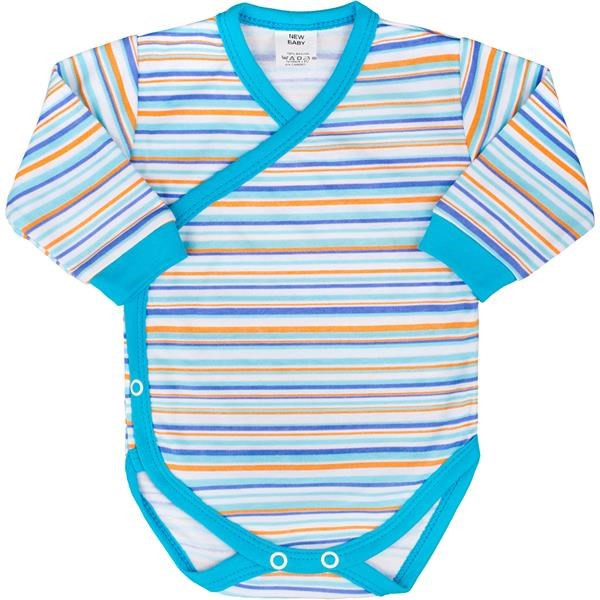 Bavlnené celorozopínacie dojčenské body s dlhým rukávom New Baby Puppik 2. Body je celopotlačené modernými farebnými pruhmi. Rukávky sú ukončené širokým farebným lemom. Praktické bočné zapínanie na cvočky po celej dĺžke a medzi nožičkami. Rozmery: obvod okolo hrudníka cca 42 cm, dĺžka od ramienok cca 34 cm, dĺžka rukáva cca 17 cm. Zloženie: 100% bavlna.