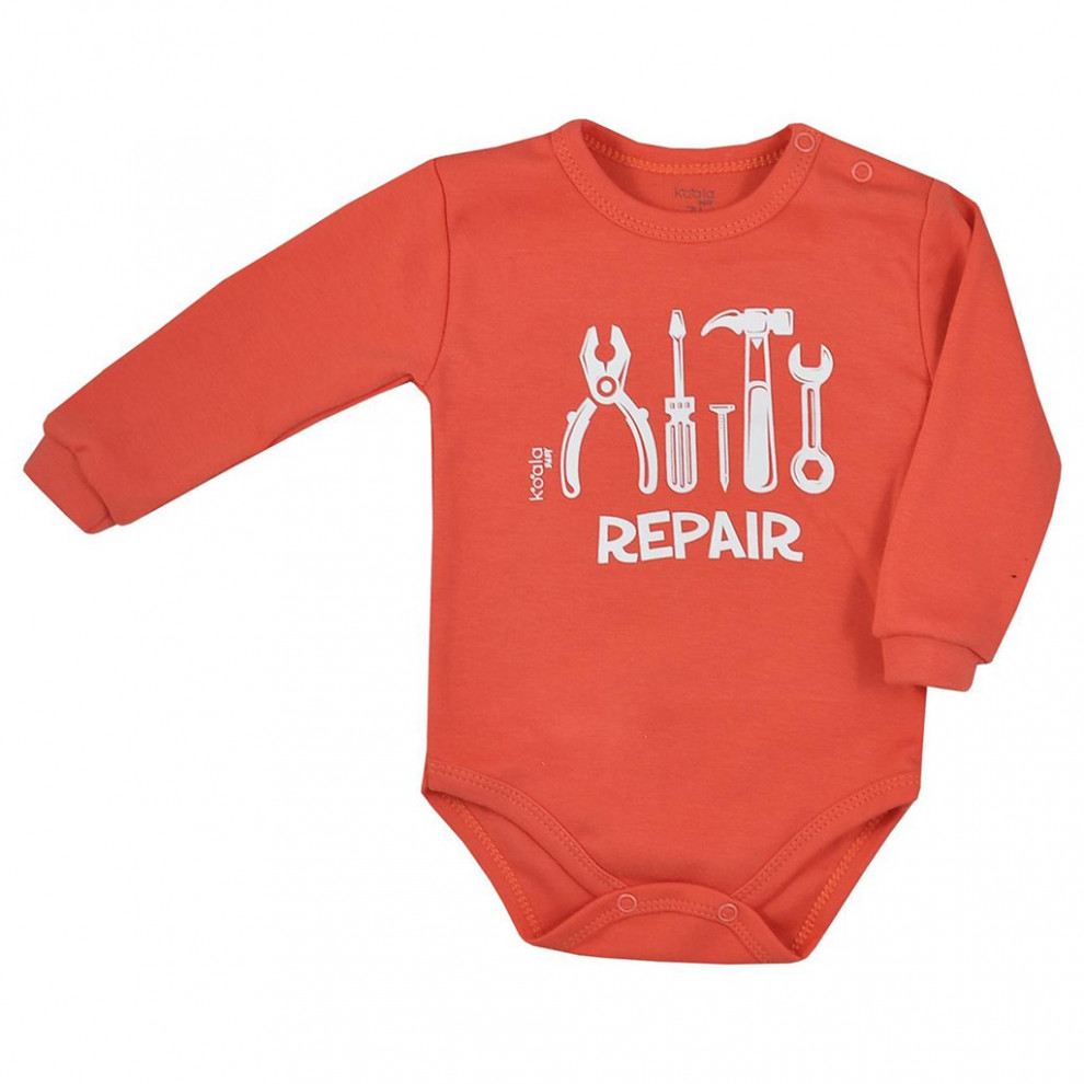 Body s dlhým rukávom Koala Repair. Body má zapínanie na cvočky na ramienku a medzi nožičkami čo uľahčuje obliekanie a prebaľovanie. Zdobí ho nápis Repair a obrázok kutilského náradia. Materiál: 100% bavlna.
