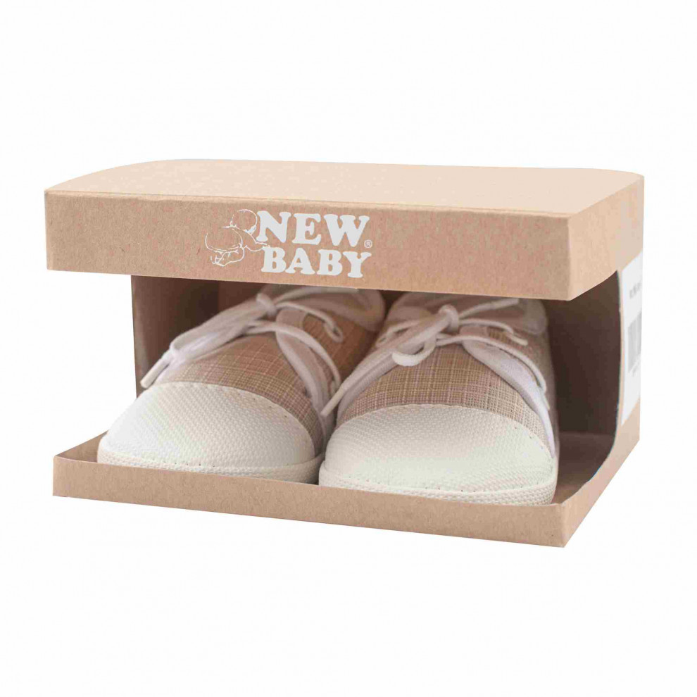 Dojčenské capačky New Baby pre bábätká. Krásne topánočky sú v štýle tenisiek s moderným vzhľadom na zaviazovanie na šnúrku. Topánočky priliehajú k nožičke a majú široké vnútro, čo umožňuje voľný pohyb prstov a svalov. Výrobok nie je určený na chôdzu. Sú veľmi ľahké s tenkou syntetickou podrážkou. Zloženie: 80% bavlna, 20% polyester. Podrážka: syntetický materiál. Dĺžka vnútornej stielky 12 cm. Určené pre deti 6-12 mesiacov. Vhodné pre chlapčekov i dievčatká. Dodávané v praktickej EKO krabičke. Upozornenie: pod textilnou vložkou sa nachádza papierová vložka, ktorá drží tvar capačky. Pred prvým použitím odstráňte túto papierovú vložku.