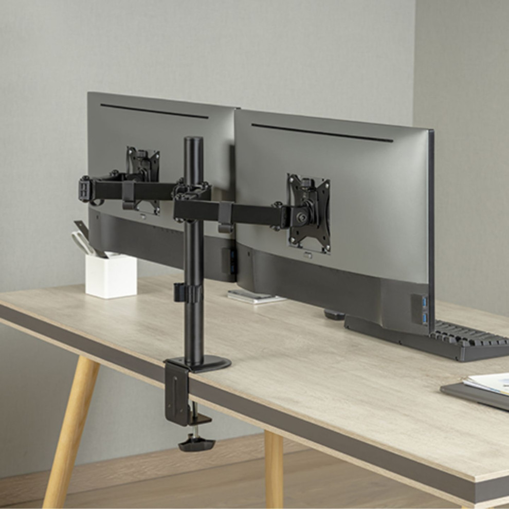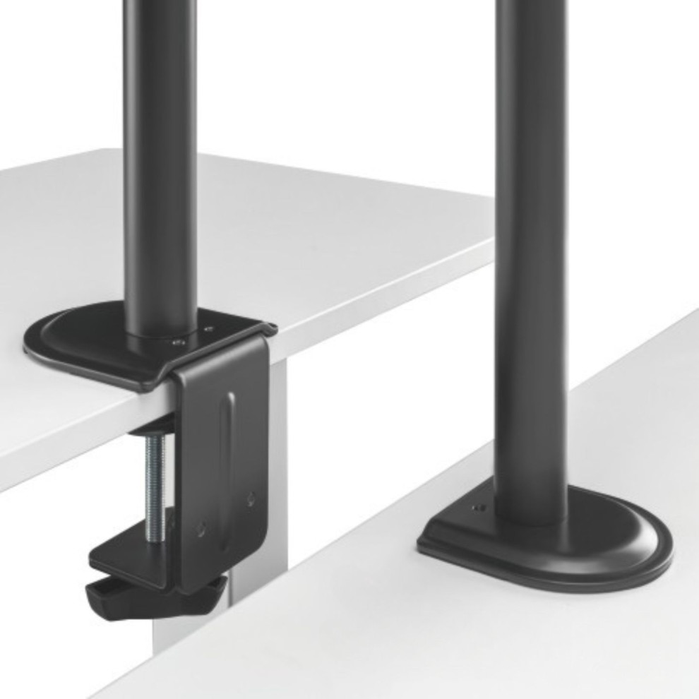 Díky odolné ocelové konstrukci poskytuje stabilní podporu pro dva monitory s úhlopříčkou 17" až 32" a hmotností až 9 kg na rameno. Flexibilní konstrukce pro dostatečné nastavení výšky a pozorovacích úhlů s možností nastavení orientace monitoru na výšku nebo na šířku. Součástí balení jsou průchodky a svorky pro instalaci na téměř jakoukoliv pracovní plochu. Odnímatelná deska VESA pro uživatelsky přívětivou instalaci. Součástí balení jsou kabelové spony pro usnadnění organizace vedení kabelů.