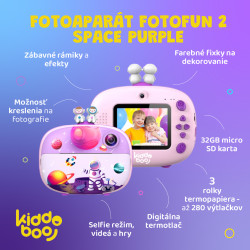 Fotoaparát FotoFun 2 Space PurpleFoťák plný hviezdnych momentovHľadáte ideálny darček pre zvedavé dieťa, ktoré miluje zábavu, kreslenie a objavovanie sveta? Detský fotoaparát Kiddoboo FotoFun 2 Space Purple je presne to, čo hľadáte! Tento rozkošný kamarát ponúka nielen možnosť fotografovania a natáčania videí, ale aj okamžitú tlač fotografií – a to všetko v dizajne, ktorý si deti okamžite zamilujú. Tento detský instantný fotoaparát je ideálny spoločník na výlety, oslavy, prázdniny aj bežné dni plné objavovania. Premení každé dobrodružstvo na spomienku.Vytvor – Vytlač – Vyfarbi!Zábavné rámiky a efekty – pre originálne výtvoryMožnosť kreslenia na fotografie – v balení nájdete farebné fixkySelfie režim, videá a hry – zábava na každom krokuVšetko v jednom baleníDetský fotoaparát FotoFun 2 Space Purple3 rolky termo papiera (až 280 výtlačkov)Farebné fixky na dekorovanie32GB micro SD karta na ukladanie fotiek a videíBatéria s výdržou na dlhé hodiny hraniaZabudované mäkké ochranné puzdro a šnúrka na krkPrečo si vybrať Kiddoboo Fotoaparát FotoFun 2 Space Purple?Rozvíja detskú kreativitu a motorikuPodporuje samostatnosť a zábavnú formu učeniaVhodný darček pre deti od 3 rokov