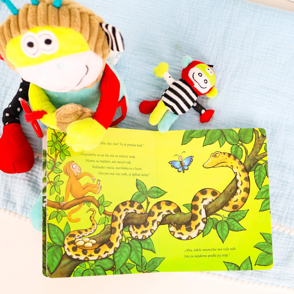 Hľadá sa mamaV milom veršovanom leporele od Julie Donaldson a Axela Schefflera, autorov Gruffala, sa opička stratí v džungli a s pomocou láskavého motýľa hľadá mamičku.