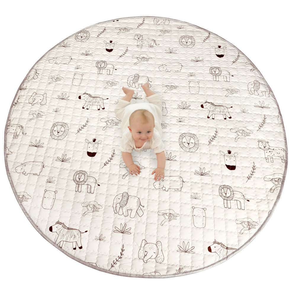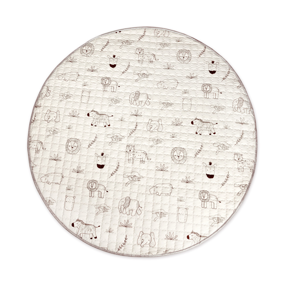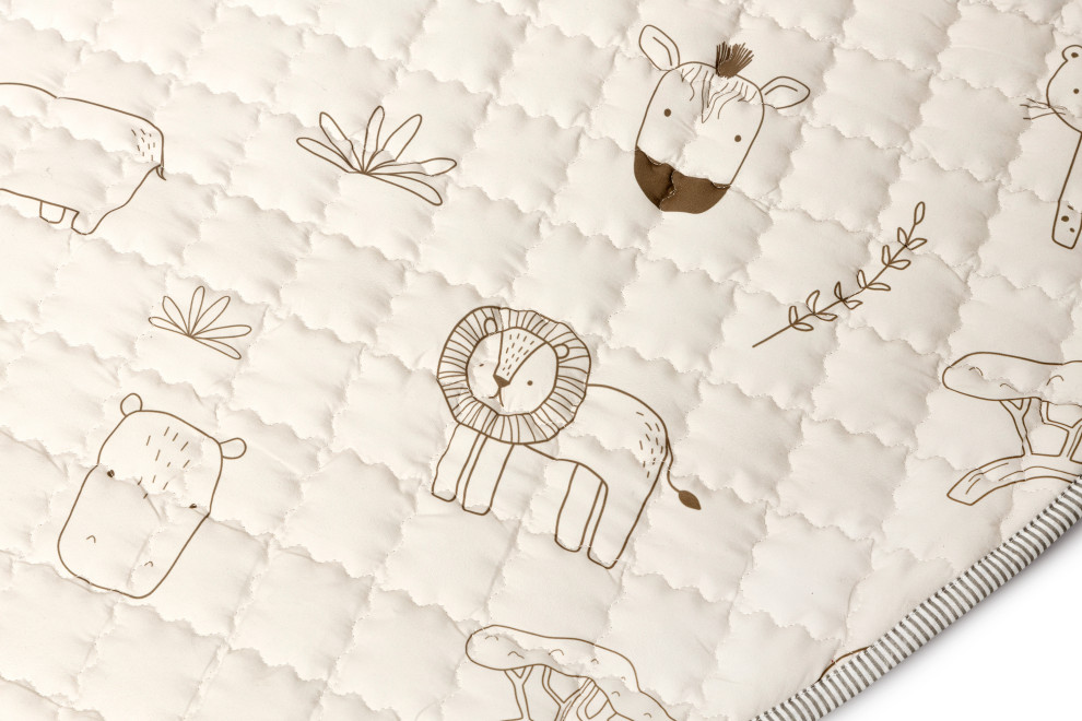 Hracia podložka prešívaná Safari Animals 1.5 mŠtýlová a praktická podložka Štýlová a praktická hracia podložka v krásnom prevedení so safari zvieratkami dokonale zapadne do obývačky alebo detskej izby a zároveň zabaví vaše bábätko. Nádherné, jemné farby podložky vytvoria útulné, ale aj bezpečné miesto na hranie a lezenie. Protišmykový povrch zaručuje bezpečnosť pri každej hre, takže vaše dieťatko môže objavovať svet bez obáv.Flexibilná podložka nielen na hranieSkladacia podložka s priemerom 150 cm a hrúbkou 1,5 cm ponúka dostatok priestoru nielen pre hranie bábätiek, ale aj pre rôzne rodinné aktivity. Využijete ju aj na jogu, športové cvičenia či dokonca piknik v prírode. Navyše, hracia podložka sa veľmi ľahko čistí a je vyrobená z mäkkej polyesterovej tkaniny šetrnej k pokožke.