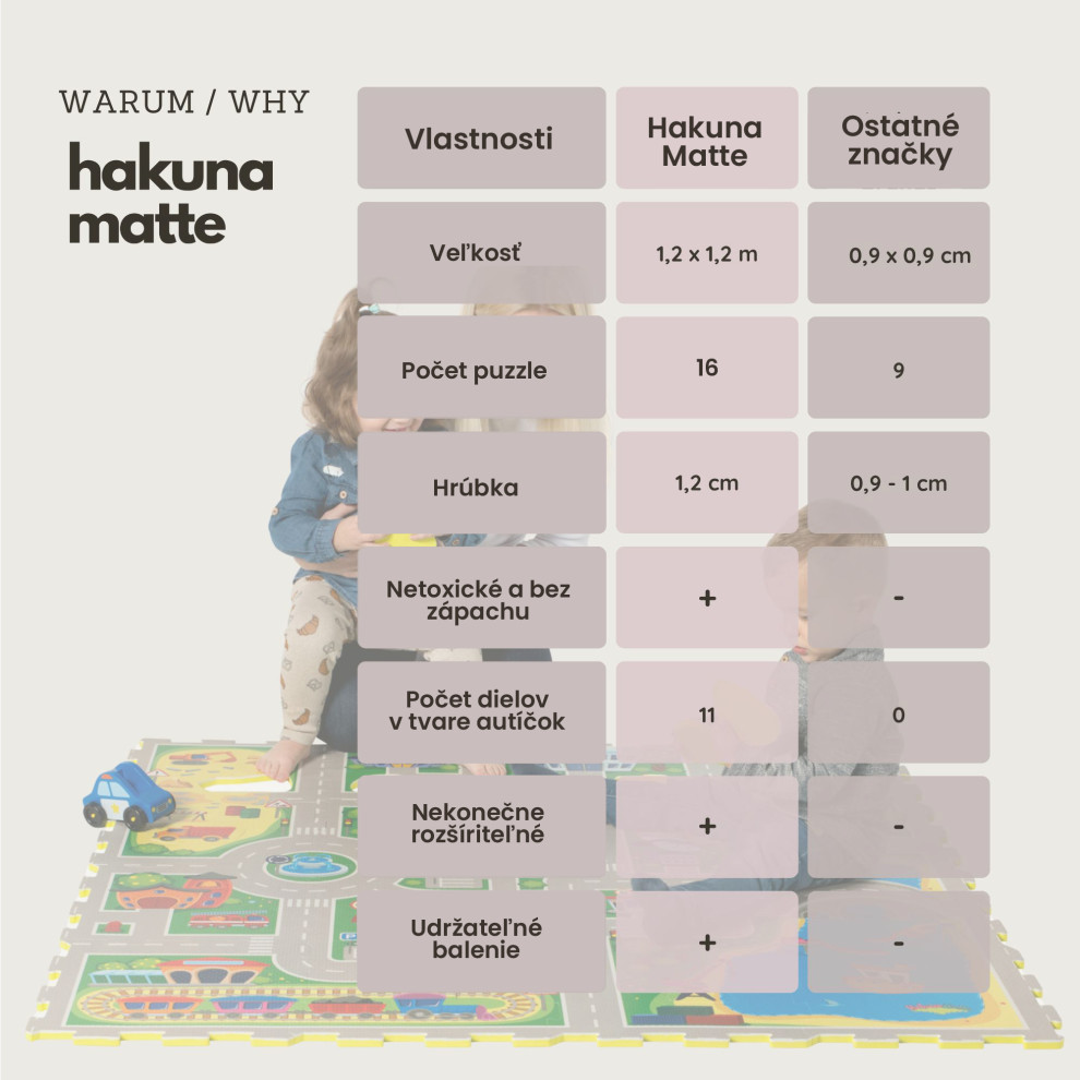 Hracia podložka Puzzle Mesto 1.2 x 1.2 mVytvorte si fantastické puzzle mestoZažite dobrodružstvo v úžasnom Puzzle Meste. Tento hravý koberec pozostáva zo 16 puzzle dielov, ktoré vytvárajú pestré cesty a budovy ako štadión, nemocnica, stavenisko a prístav. Deti sa môžu zabávať s 11 odnímateľnými tvarmi vozidiel, ktoré slúžia ako skvelé hračky na hranie. Vytvorte si vlastné mesto plné dobrodružstva a objavovania, kde si deti môžu rozvíjať svoju kreativitu a motorické zručnosti.Bezpečná zábava pre najmenšíchHracia podložka Puzzle Mesto je vyrobená z kvalitnej EVA peny, ktorá je hrubá 1,2 cm a o 20% mäkšia a teplejšia ako iné alternatívy, čo zabezpečuje pohodlné a bezpečné hranie. Podložka je vodeodolná a jednoducho ju vyčistíte mydlom a handričkou, takže ju môžete používať nielen doma, ale aj vonku. Navyše, je 100% bez zápachu a neobsahuje nebezpečné látky ako formamid, BPA a ftaláty. Puzzle Mesto môžete rozšíriť o ďalšie puzzle koberce a vytvoriť tak ešte väčšie miesto na hranie.