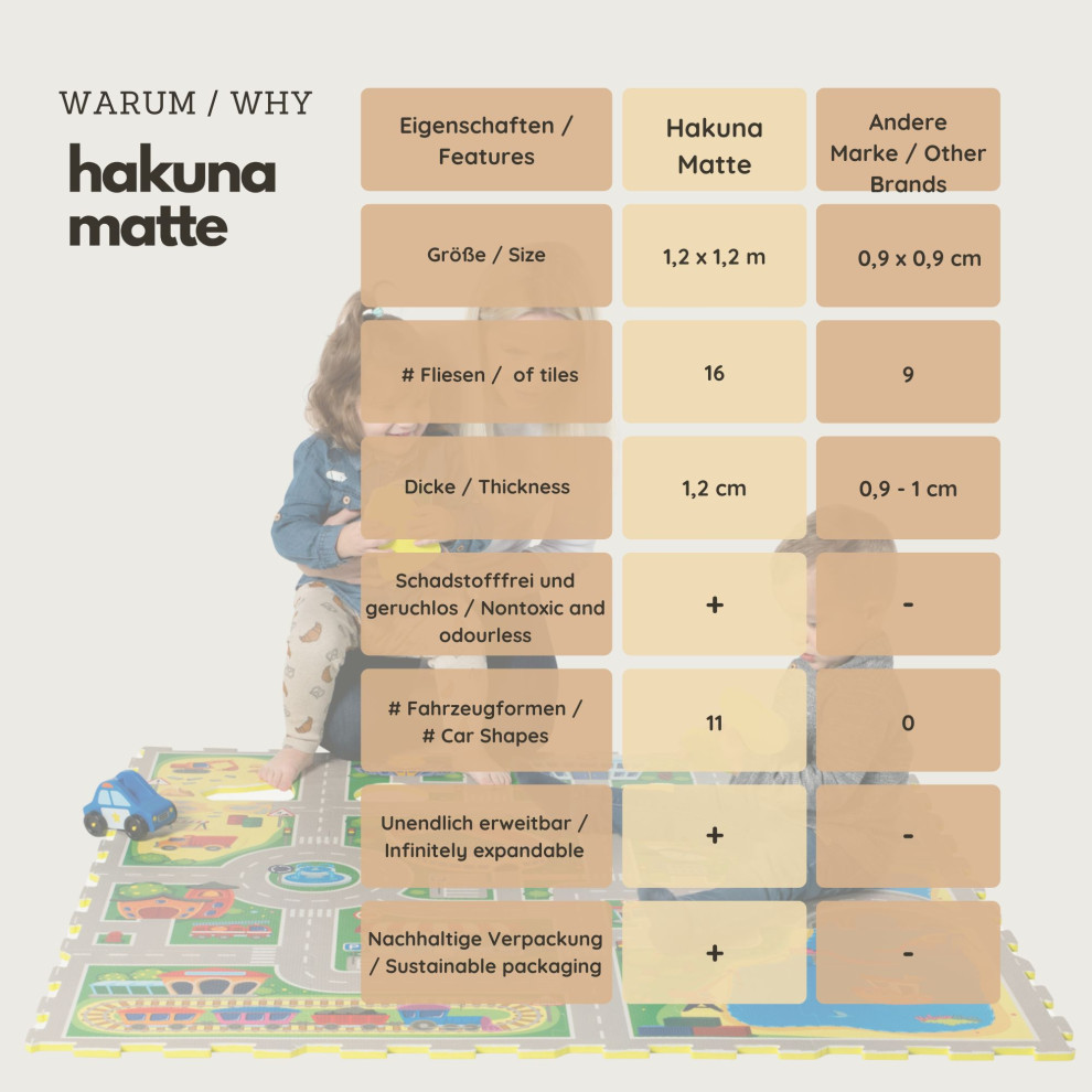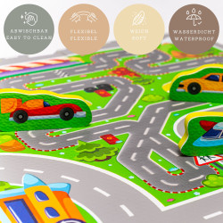 Hracia podložka Puzzle Vacation 1.2 x 1.2 mInteraktívna hracia podložka pre malých dobrodruhovHracia podložka Puzzle Vacation je vyrobená z prémiovej EVA peny, ktorá sa vyznačuje vysokou hustotou a mimoriadnou odolnosťou. V porovnaní s bežnými modelmi je až o 20 % hrubšia – jej hrúbka 1,2 cm poskytuje deťom väčšie pohodlie pri hre, lepšiu tepelnú izoláciu a mäkký, pružný povrch, ktorý výborne tlmí nárazy. Vďaka tomu sa stáva ideálnou voľbou nielen na hranie v detskej izbe, ale aj na chladnejšej podlahe či vonku na terase alebo v záhrade. Povrch podložky je vodoodolný a jednoducho sa čistí – stačí vlhká handrička a trocha mydla. Aj pri každodennom používaní si zachováva svoj tvar a vzhľad. Bezpečnosť vášho dieťaťa je pre nás prioritou. Podložka je bez zápachu, neobsahuje žiadne škodlivé látky ako formamid, BPA ani ftaláty, čím zaručuje zdravé a bezpečné prostredie na hru.Podložka, ktorá rastie spolu s fantáziou vášho dieťaťaVýnimočnou výhodou tejto puzzle podložky je jej modulárny systém – jednotlivé diely do seba jednoducho zapadnú, a tak môžete bez obmedzení spojiť dve, tri alebo aj viac podložiek a vytvoriť rozsiahle mesto plné ciest, budov a dobrodružstiev. Vďaka tomu rastie podložka spolu s fantáziou vášho dieťaťa – od malej uličky až po celé dopravné impérium.