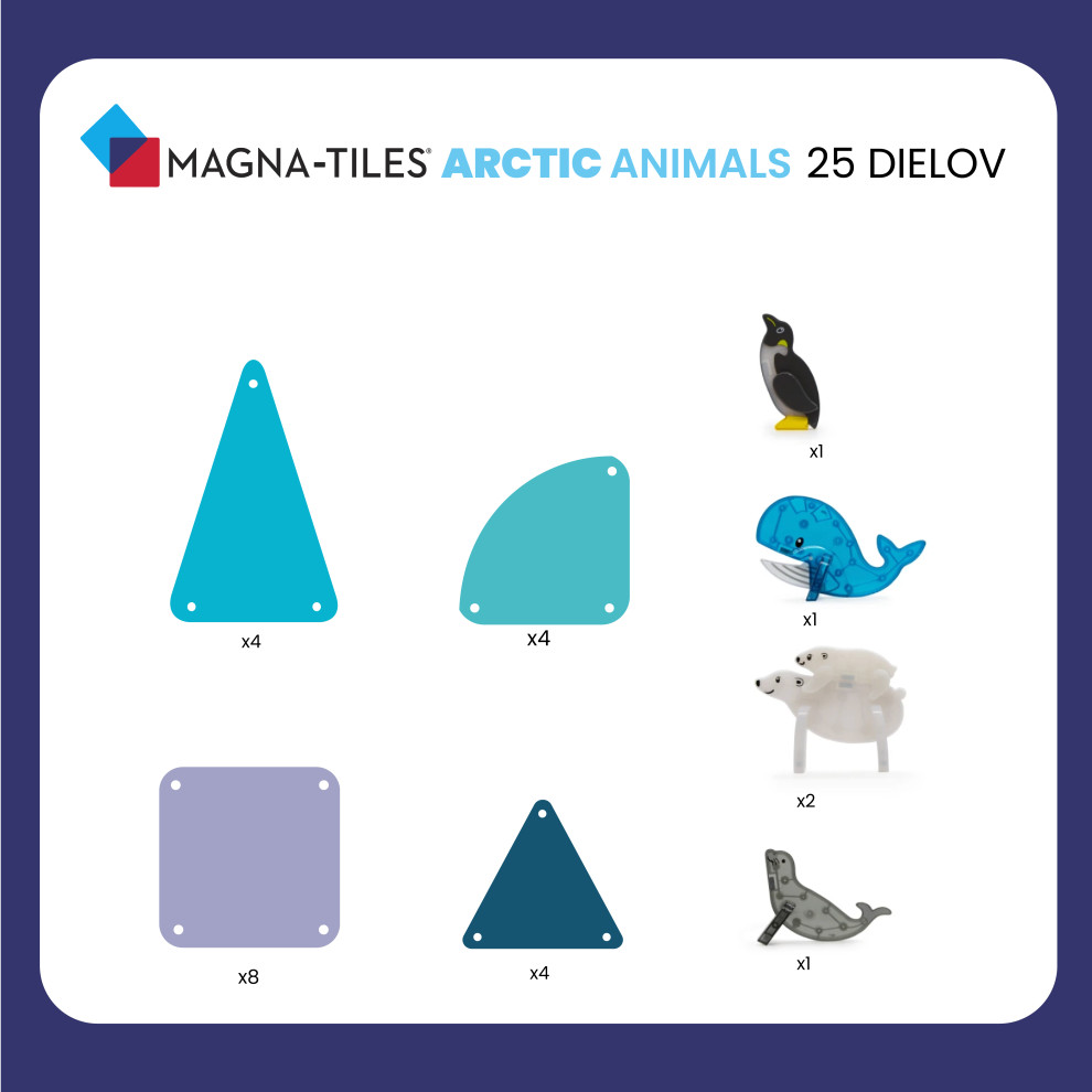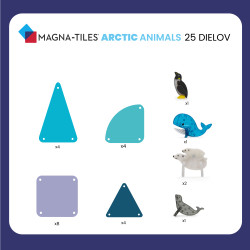 Magnetická stavebnica Arctic 25 dielovPostavte si vlastnú arktickú krajinuÚžasná magnetická stavebnica Magna-Tiles® Arctic prináša hodiny nápaditej a sústredenej zábavy. Obsahuje päť arktických zvieracích priateľov: tučniaka, tuleňa, mláďatko ľadového medveďa, ľadového medveďa a veľrybu a taktiež magnetické dieliky s detailmi ľadu a zvieracích stôp. Deti si môžu vytvoriť vlastné prostredie plné ľadovcov a zvierat pochádzajúcich z chladnejšieho podnebia a zároveň sa naučiť fakty o polárnych zvieratkách. Vymýšľajte stále nové varianty a rozmanité stavby. Stavebnica je kompatibilná so všetkými magnetickými sadami Magna-Tiles.Zmysluplná stavebnica pre malých staviteľovMagna-Tiles je zástancom zmysluplnej hry, to znamená zábavnej a pútavej, no zároveň založenej na rozvíjaní detských zručností. Táto stavebnica podporuje rozvoj koordinácie ruka-oko, jemnej motoriky a logického myslenia prostredníctvom skúmania príčiny a následku. Bezpečnosť a špičková kvalita sú zaistené použitím potravinárskeho, netoxického plastu MABS bez BPA, ftalátov a latexu. Pevná konštrukcia dielikov zabraňuje praskaniu a udržiava magnety bezpečne na svojom mieste.Sada obsahuje 25 magnetických dielikov:5x figúrka - tuleň, ľadový medveď, mláďa ľadového medveďa, tučniak a veľryba,8x štvorec,4x rovnoramenný trojuholník,4x, rovnostranný trojuholník,4x štvrťkruh.