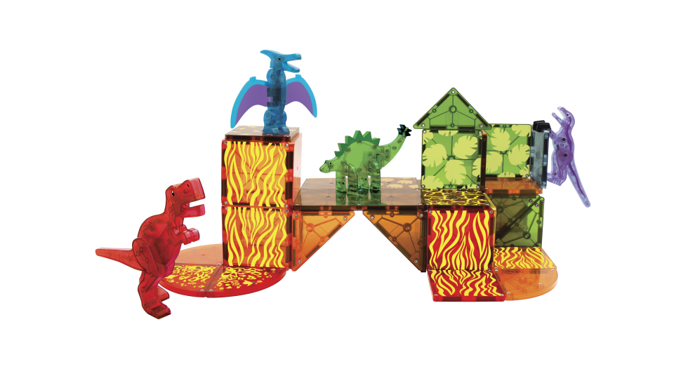 Magnetická stavebnica Dino 40 dielovPripravte sa na vulkanické výbuchy, roztavenú lávu a veľkých dinosaurovMagnetická stavebnica Dino obsahuje štyri nadrozmerné magnetické dinosaury a pestrofarebné dieliky so sopečnou tematikou Jurského parku. Nájdete tam Pteranodona, T-Rexa, Stegosaurusa a Velociraptora. Každý dinosaurus má pohyblivé časti, vďaka ktorým je skvelý k mnohým hrám. Deti okrem jemnej motoriky a logiky zároveň rozvýjajú záujem o paleonotológiu. Stavebnica je kompatibilná so všetkými súpravami Magna-Tiles®.Zmysluplná stavebnica pre malých staviteľovMagna-Tiles je zástancom zmysluplnej hry, to znamená zábavnej a pútavej, no zároveň založenej na rozvíjaní detských zručností. Táto stavebnica podporuje rozvoj koordinácie ruka-oko, jemnej motoriky a logického myslenia prostredníctvom skúmania príčiny a následku. Bezpečnosť a špičková kvalita sú zaistené použitím potravinárskeho, netoxického plastu MABS bez BPA, ftalátov a latexu. Pevná konštrukcia dielikov zabraňuje praskaniu a udržiava magnety bezpečne na svojom mieste.Sada obsahuje 40 magnetických dielikov:4x figúrka dinosaurov - Pteranodon (modrý), T-Rex (červený), Stegosaurus (zelený) a Velociraptor (fialový),24x štvorec,6x pravý trojuholník,1x, obdĺžnik,1x veľký obdĺžnik,4x štvrťkruh.