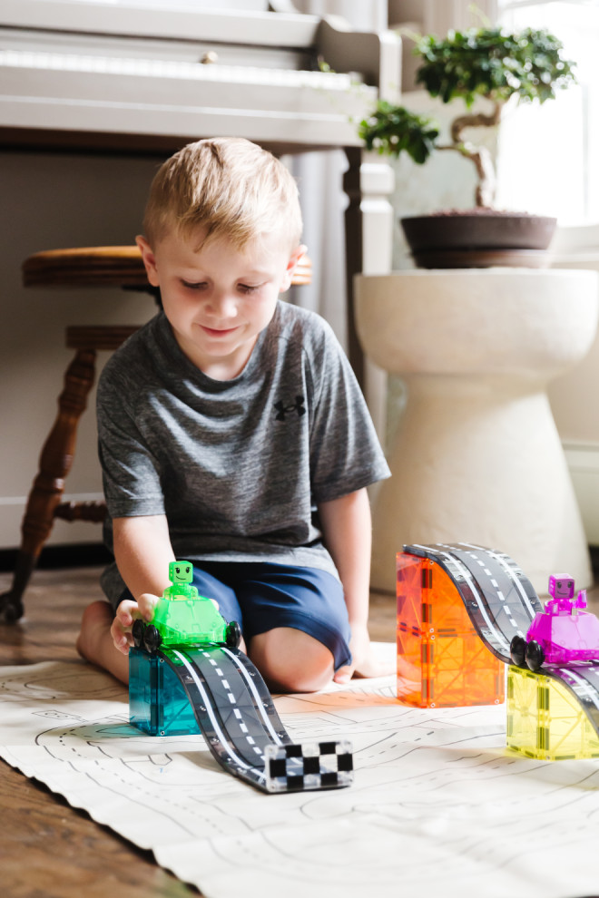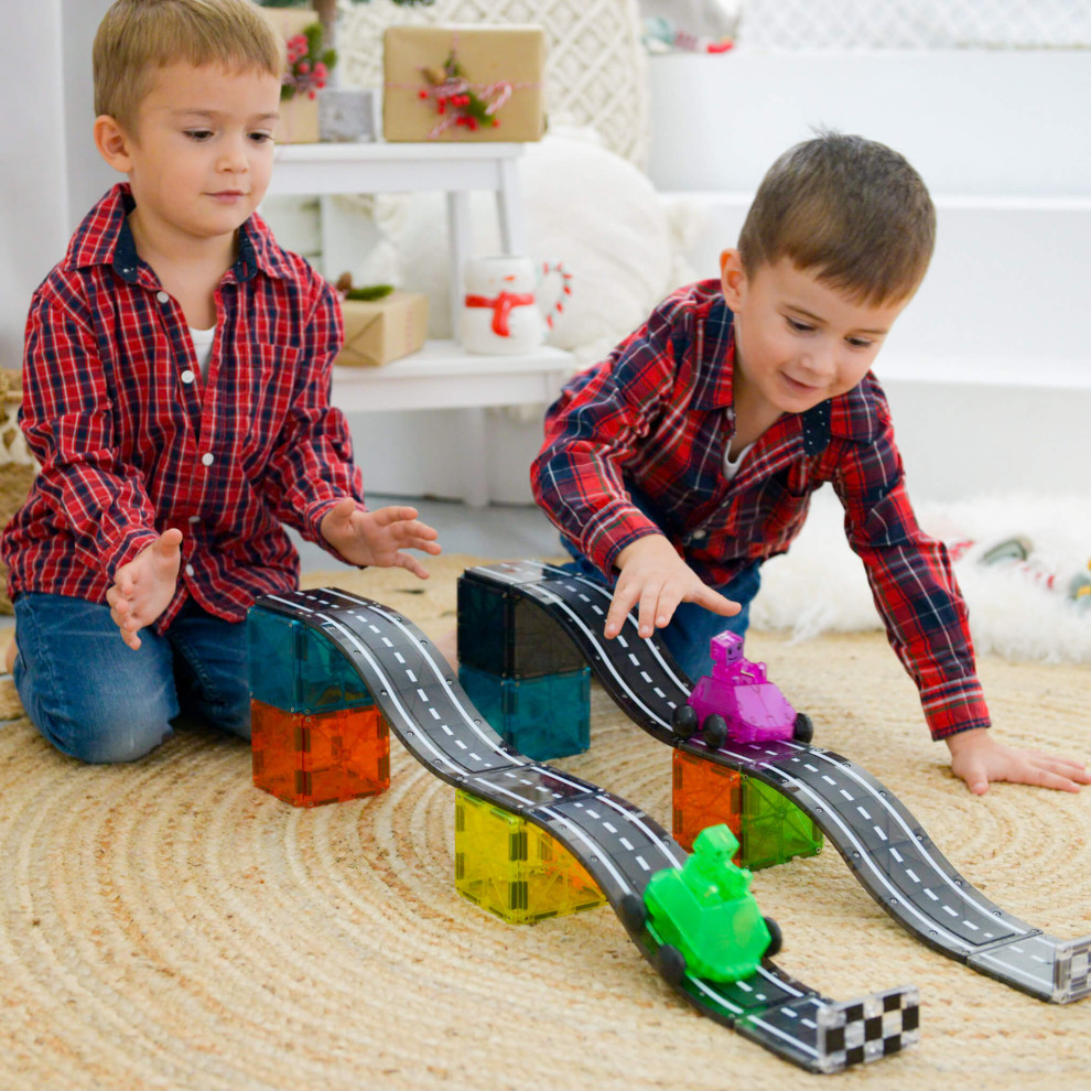 Magnetická stavebnica Downhill Duo 40 dielovPripraviť sa, pozor, štartMilujú vaše deti autá? Predstavujeme vám magnetickú súpravu Magna-Tiles Downhill Duo, ktorá obsahuje plne magnetické figúrky vozidiel a jazdcov. Malí pretekári si môžu postaviť mega rampu alebo usporiadať preteky dvojíc v zjazde vedľa seba. Všetky diely sú plne kompatibilné a dopĺňajú sa so všetkými ostatnými súpravami Magna-Tiles, vrátane obľúbených súprav Builder a Metropolis. Skvelý spôsob, ako inšpirovať detskú kreativitu, budovať motorické zručnosti a podporovať učenie detí.Zmysluplná stavebnica pre malých staviteľovMagna-Tiles je zástancom zmysluplnej hry, to znamená zábavnej a pútavej, no zároveň založenej na rozvíjaní detských zručností. Táto stavebnica podporuje rozvoj koordinácie ruka-oko, jemnej motoriky a logického myslenia prostredníctvom skúmania príčiny a následku. Bezpečnosť a špičková kvalita sú zaistené použitím potravinárskeho, netoxického plastu MABS bez BPA, ftalátov a latexu. Pevná konštrukcia dielikov zabraňuje praskaniu a udržiava magnety bezpečne na svojom mieste.Sada obsahuje 40 magnetických dielikov:4x rampa,2 x vozidlo (zelené a fialové),2x figúrka (zelená a fialová,6x štvorec cesta,24x štvorec,2x obdlžník označujúci cieľ.