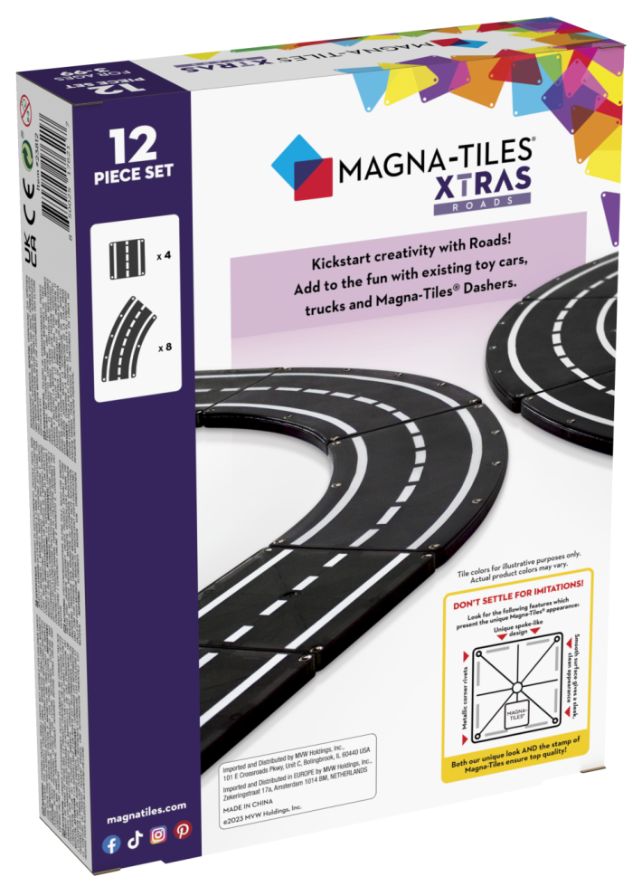 Magnetická stavebnica Xtras Roads 12 dielovPostavte si vlastnú diaľnicu či pretekársku dráhuMagnetická stavebnica Magna-Tiles XTRAS Roads otvára deťom nekonečné možnosti kreativity pri vytváraní rôznych typov ciest pre ich obľúbené hračky a vozidlá. Diaľnice, pretekárske dráhy či mestské ulice postavia vďaka magnetickým spojeniam veľmi rýchlo a jednoducho. Sada obsahuje všetko potrebné na dokončenie dokonalého kruhu (8 kriviek) alebo oválnej pretekárskej dráhy (8 kriviek + 4 štvorce). Stavebnica je kompatibilná so všetkými ostatnými sadami Magna-Tiles, takže možnosti kombinovania a rozširovania sú takmer nekonečné.Zmysluplná stavebnica pre malých staviteľovMagna-Tiles je zástancom zmysluplnej hry, to znamená zábavnej a pútavej, no zároveň založenej na rozvíjaní detských zručností. Táto stavebnica podporuje rozvoj koordinácie ruka-oko, jemnej motoriky a logického myslenia prostredníctvom skúmania príčiny a následku. Bezpečnosť a špičková kvalita sú zaistené použitím potravinárskeho, netoxického plastu MABS bez BPA, ftalátov a latexu. Pevná konštrukcia dielikov zabraňuje praskaniu a udržiava magnety bezpečne na svojom mieste.Sada obsahuje 12 magnetických dielikov:8x zákruta (45 stupňov),4x cestný štvorec.