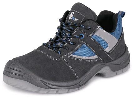 Pracovní polobotka, perforovaná, bez ocelové špice. Materiál: svršek z 1,4 - 1,6 mm kvalitní broušené kůže kombinovaný s prodyšnou tkaninou Cambridge, PU reflexní doplňky, prodyšná oděru odolná mesh podšívka, podešev: PU-TPU, protiskluzová, antistatická, olejivzdorná.