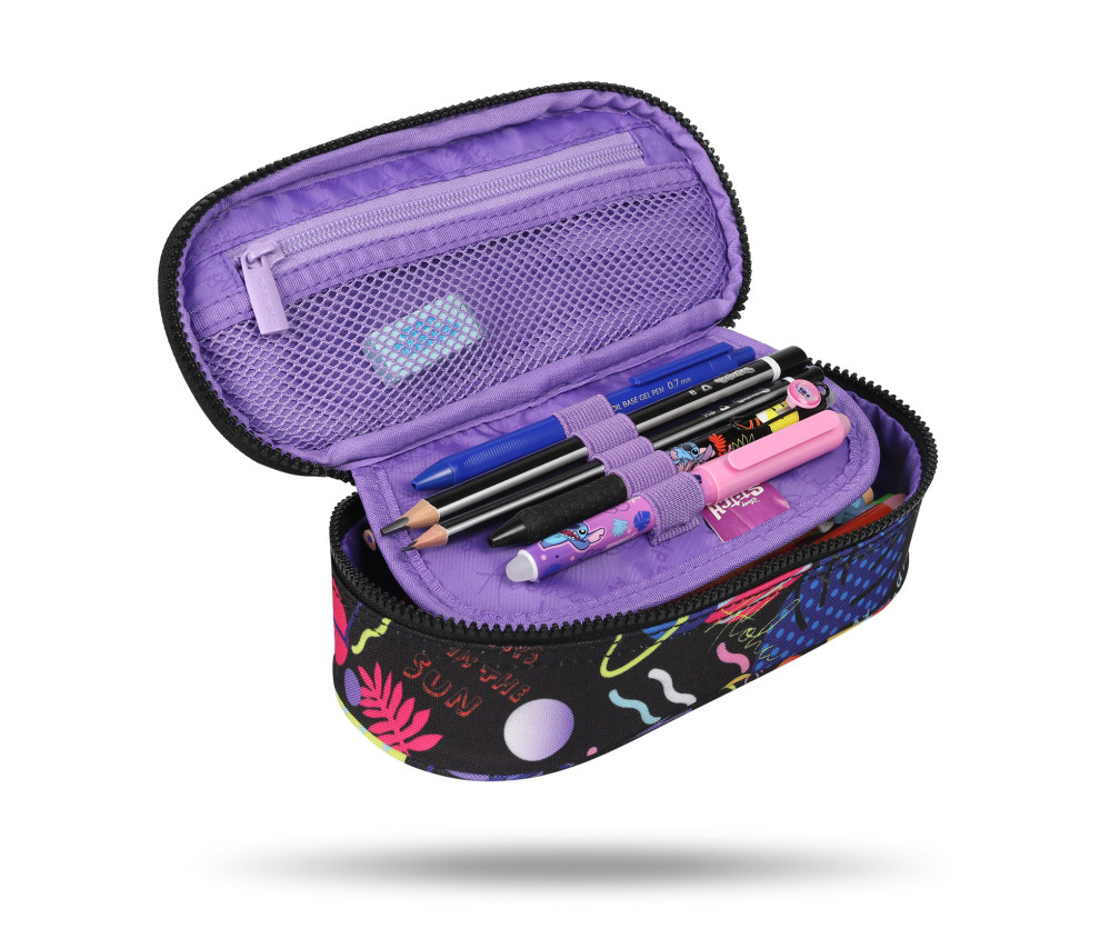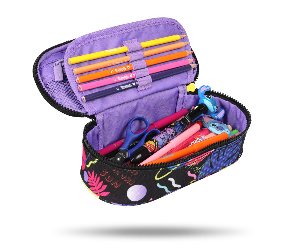 Peračník Campus Stitch BlackPeračník s vnútorným vreckom na zips a gumičkamiPeračník Campus Stitch Black je ideálnym riešením pre deti, ktoré potrebujú praktické a zároveň štýlové miesto na písacie potreby. Tento voľný peračník s integrovanou chlopňou a gumičkami na ceruzky, perá či iné písacie nástroje poskytuje dostatok miesta aj pre drobnosti na kreatívnu činnosť, ktoré do bežného peračníka nevojdú. Vnútorné sieťové vrecko na zips a rozmer 22 × 6,5 × 9,5 cm zabezpečia, že vaše veci budú vždy usporiadané. Peračník je vyrobený z kvalitného 100% polyesteru a je kompatibilný s kolekciou Stitch Black. Vybavenie nie je súčasťou peračníka.