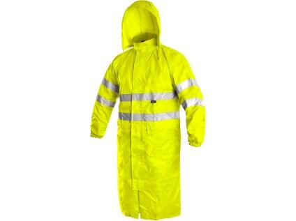 Výstražný plášť s reflexními pruhy, nepromokavý, lepené švy, odepínací kapuce v límci, zapínání na zip krytý légou, raglánové rukávy v manžetě do gumy, dvě spodní kapsy s patkou, větrání na zádech a v podpaží. Plášť je složen v praktickém balení na zip. Délka pláště 120 cm.