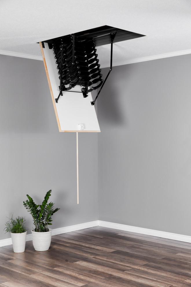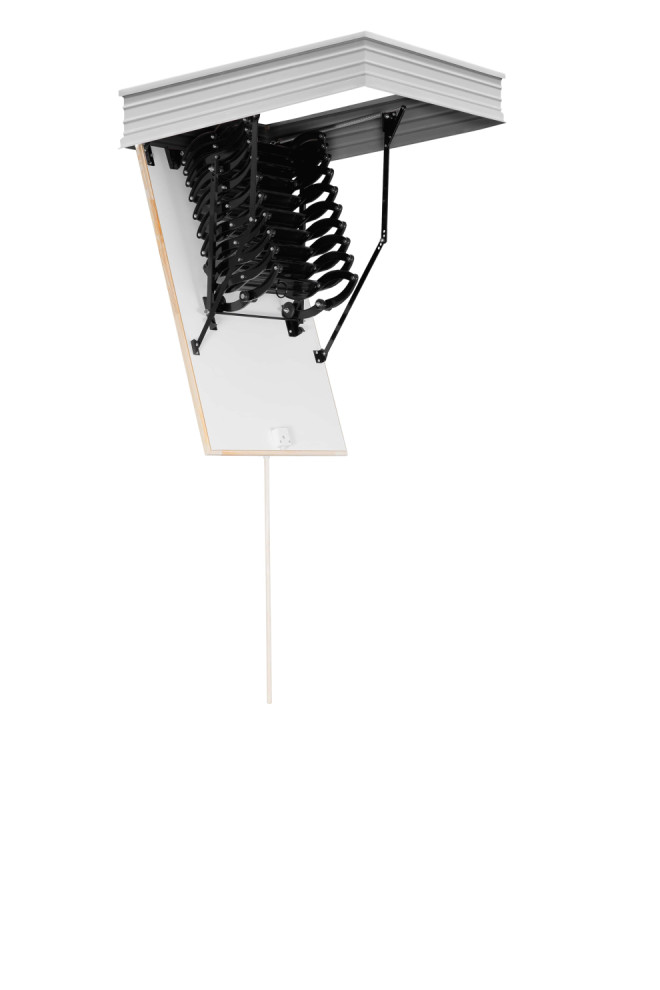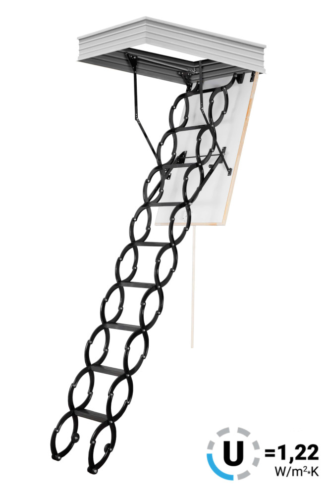 Kovové nožnicové podkrovné schody Oman sú schody určené do najmenších možných priestorov. Obľúbený horolezecký rebrík pre jeho jednoduché používanie. S nožnicovým rebríkom sa schody dajú jednoducho vysunúť, aby ste mohli vystúpiť do podkrovia, a potom zasunúť, aby ste schody zatvorili. Tieto výsuvné schody do podkrovia slúžia ako jednoduchý, praktický a izolovaný prístup do podkrovia. Nožnicové schody majú drevené izolované veko s hrúbkou 26 mm, ktoré je obložené bielou doskou HDF. Veko je izolované 20 mm polystyrénom. Nožnicové schody sú vyrobené pre maximálnu výšku podlahy 290 cm a majú kovový rám vysoký 14,5 cm. Schody majú celokovový rebrík na lezenie s protišmykovými stupňami. Maximálne možné zaťaženie nožnicových podkrovných schodov je 150 kg. Súčasťou balenia je tyč na vyťahovanie, sada pružín na jednoduché otváranie a zatváranie schodov a zatvárací mechanizmus (zámok) - schody teda stačí len rozbaliť a namontovať. Skladacie nožnicové schody do podkrovia sú ideálnym riešením pre prístup do podkrovia. Sú vhodné všade tam, kde nie sú vysoké nároky na energetickú účinnosť budovy. Súčiniteľ prestupu tepla U=1,22W/m2*K.