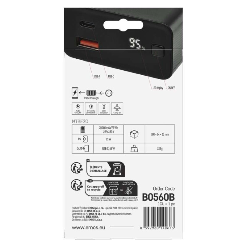 Power bank EMOS NTBF20, 20 000 mAh, 65 W PD, čierny