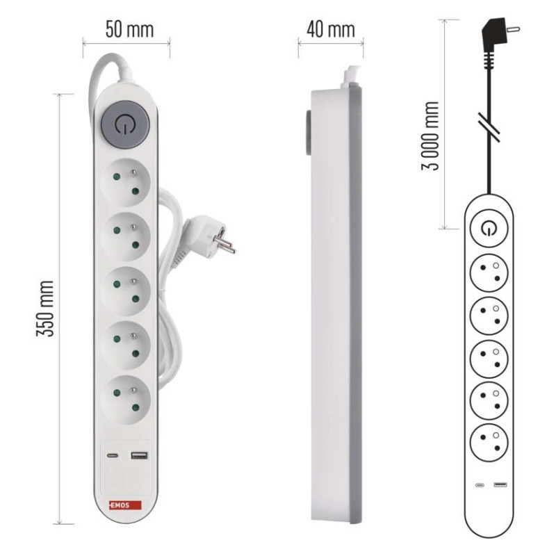 • Predlžovací kábel 3 m / 5 zásuvky / s vypínačom / biely / 1×USB-A + 1×USB-C / 1,5 mm2