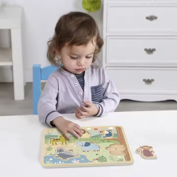 Puzzle so zvukmi Zvieratká z džungle PastelSpoznajte zvuky zvierat hravou formou Puzzle so zvukmi zvierat v krásnych pastelových farbách zaujme všetkých malých objaviteľov. Deti si môžu poskladať leva, tukana, slona, mroža, opicu či tigra a pri zdvihnutí dielika ich prekvapí autentický zvuk každého zvieratka. Vkladacie puzzle rozvíja jemnú motorikuVkladacie puzzle tiež zlepšuje koordináciu oko-ruka, trpezlivosť a schopnosť samostatne sa hrať. Vďaka veľkým dielikom je vhodné už pre deti od 18 mesiacov.