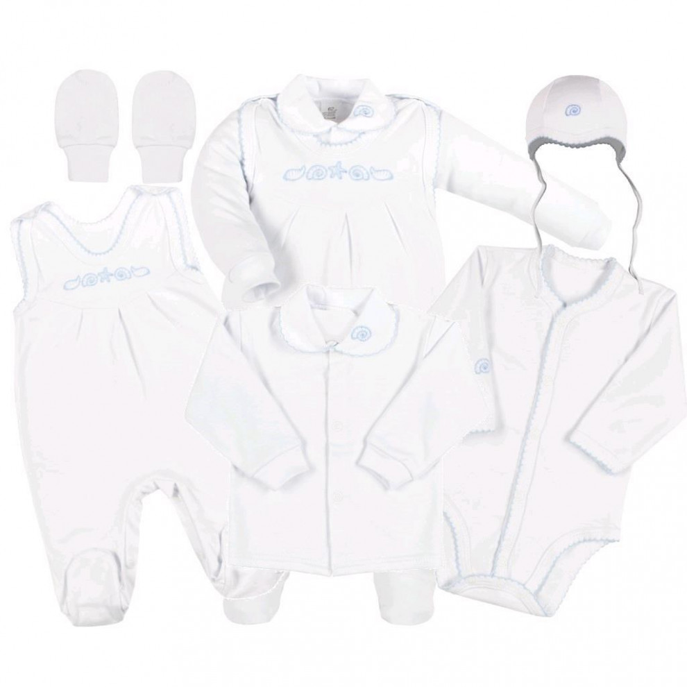 Kojenecká súpravička, ktorá obsahuje dupačky, body s dlhým rukávom, kabátik, rukavičky a čiapočku. Zloženie: 100% bavlna.