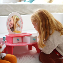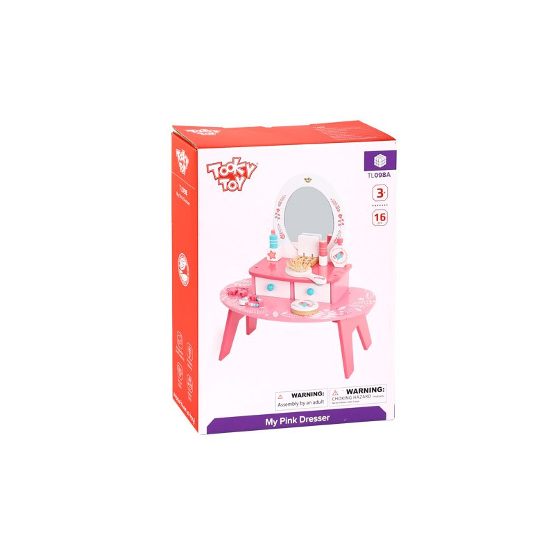 Toaletný kozmetický stolíkDrevený toaletný stolík pre deti so záujmom o módu.Už malé deti radi napodobňujú dospelákov a aj preto sa dievčatá rady parádia. Či už sa chcú hrať na princezné, modelky alebo mamičky, malý kozmetický stolík im v tom pomôže.Rad doplnkov zaistí veľa zábavy.Okrem zrkadla má kozmetický stolík tiež vlastné úložné priestory v podobe 2 zásuviek a 2 odkladacích poličiek. S upratovaním všetkých doplnkov - rúžu, laku, pudrenky, zrkadielka, kefy na vlasy, gumičky, náramku či parfumu – tak problém nebude. Drevená zostava je vhodná pre deti od 3 rokov.