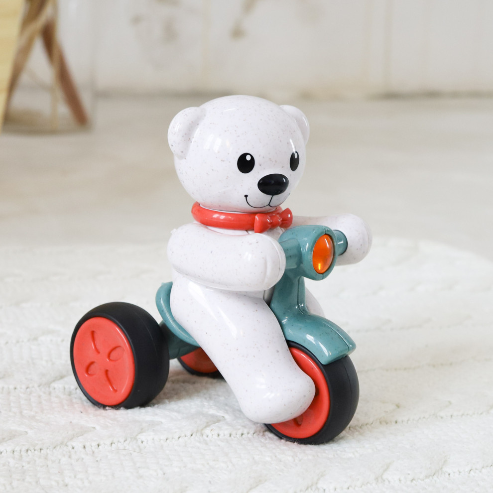 Tolo Medvedík na trojkolke je perfektná hračka pre všetky deti, ktoré milujú zábavu a pohyb. Stačí stlačiť medvedíkovi hlavičku a pustiť ho.Vďaka zabudovanému mechanizmu sa medvedík rozbehne a bude sa veselo jazdiť na trojkolke. Deti si tak užijú hru plnú pohybu a smiechu.