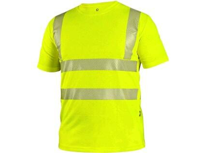 Pánské výstražné tričko s krátkým rukávem, kulatý průkrčník, zpevňující krční páska, boční švy, síťovina v podpaží, segmentované reflexní pruhy: 2 horizontální, 2 vertikální (šíře 5 cm). Doporučené použití: stavebnictví, silničáři, řidiči, logistika, údržba, kolo, motorky, skladování.
