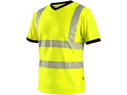 Výstražné tričko s krátkým rukávem, kontrastní olemování kolem krku a rukávů v černé barvě, průkrčník do V, zpevňující krční páska, postranní švy, větrání v podpaží, segmentované reflexní pruhy: 2 horizontální, 2 vertikální (šíře 5 cm). Doporučené použití: stavebnictví, silničáři, řidiči, logistika, údržba, kolo, motorky, skladování.