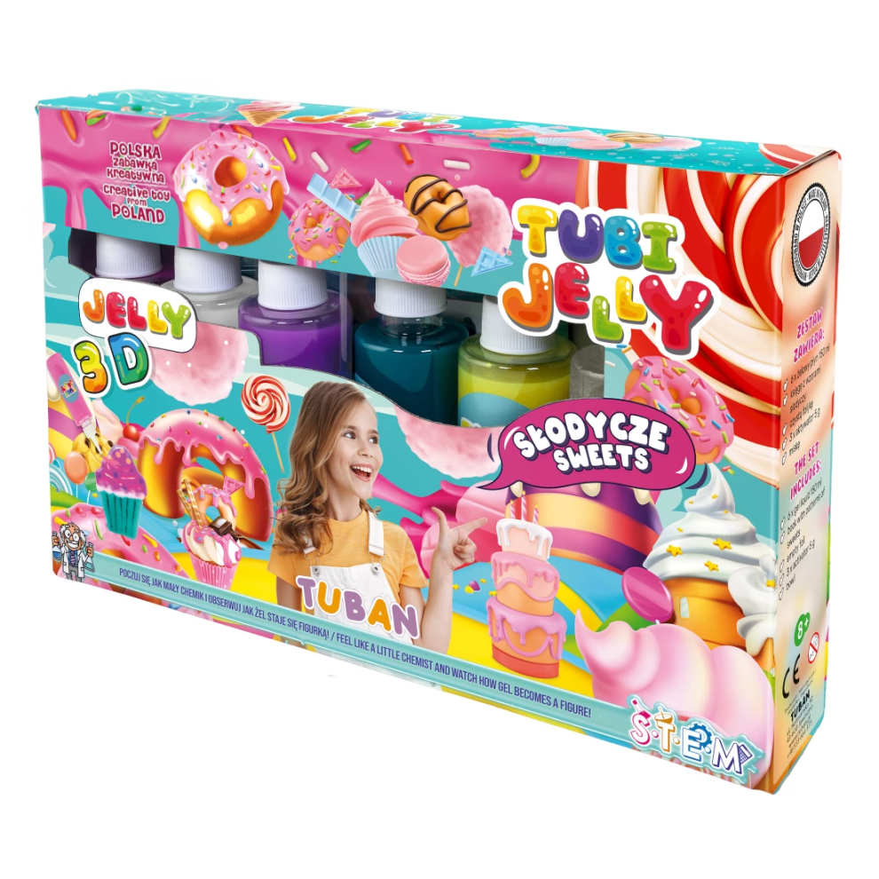 Tubi Jelly Kreatívny set XL SladkostiVytvorte si 3D gélové figúrkyTubi Jelly set je jedinečná tvorivá sada na tvorbu trojrozmerných figúrok. Set XL obsahuje až 6 farebných gélov. Súčasťou sú taktiež šablóny na kreslenie s motívmi sladkostí a koláčikov. Po vyplnení šablóny gélmi ju ponoríte do rozpusteného aktivátora a vaša postavička sa premení na svoju trojrozmernú verziu. Vďaka priloženej prázdnej fólii si deti môžu nakresliť a vytvoriť čokoľvek im napadne.Sada obsahuje:tekutý gél 150 ml v 6 farbách,tematické šablóny,3 x 5 g aktivátora,nádobu na prípravu figúrok.Ocenená hračka roka 2021V roku 2021 bol produkt Tubi Jelly ocenený titulom Hračka roka v kategórii kreatívne hračky. Vyskúšajte ho aj vy.Všetky produkty značky Tuban sú vyrobené z kvalitných materiálov, sú bezpečné a netoxické, čo znamená, že sa nemusíte obávať o zdravie svojich detí a môžete mať istotu, že ich čakajú len tie najlepšie zážitky.