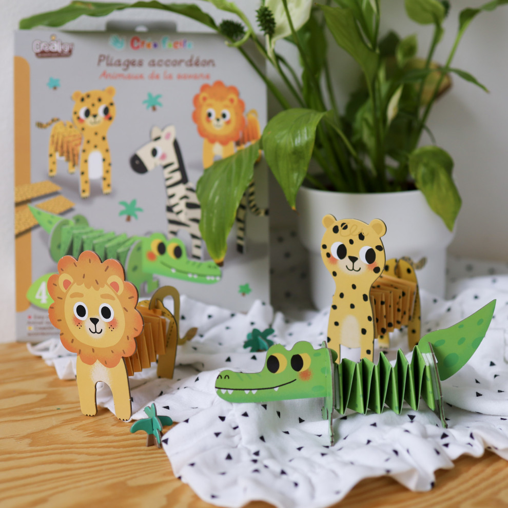 Tvorenie z papiera Zvieratká na savaneVytvor si harmonikové zvieratká zo savany!Jedinečná kreatívna súprava od francúzskej značky Crea Lign naučí deti tvoriť papierové harmoniky. Obsahuje 4 zvieratká zo savany na zostavenie a 8 papierových pásov na vytvorenie harmoník - telíček zvieratiek. Deti si zostavia figúrky zvieratiek, vytvoria im telíčka podľa návodu a po dokončení sa ich vystavia ako dekoráciu alebo sa s nimi môžem hrať. Nožnice ani lepidlo nie sú potrebné!S Crea Lign sa deti učia nové umelecké technikyTvorenie z papiera podporuje rozvoj jemnej motoriky, predstavivosti aj kreativity. Produkt je veľmi nápaditý a premyslený, rovnako ako všetky ostatné výrobky francúzskej značky Crea Lign. Jej cieľom je vyvíjať kreatívne potreby a hry, ktoré podporujú rozvoj detí a umožňujú každému z nich nájsť to, čo ho baví.