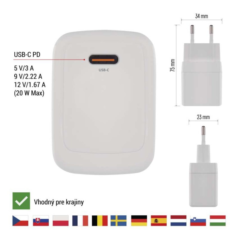 | max. výstup 1× USB | A: 5 V/3 A – 9 V/2 A – 12 V/1,5 A (18 W); C: 5 V/3 A – 9 V/2,22 A – 12 V/1,67 A (20 W) |