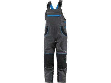 Dětské kalhoty s náprsenkou, z lehkého materiálu, náprsní kapsa na zip, boční zapínání na knoflíky, v zadní části guma s knoflíkem pro přizpůsobení velikosti, přední klínové kapsy, zadní jednoduchá kapsa, zesílená kolena, šle vzadu do gumy, reflexní doplňky.